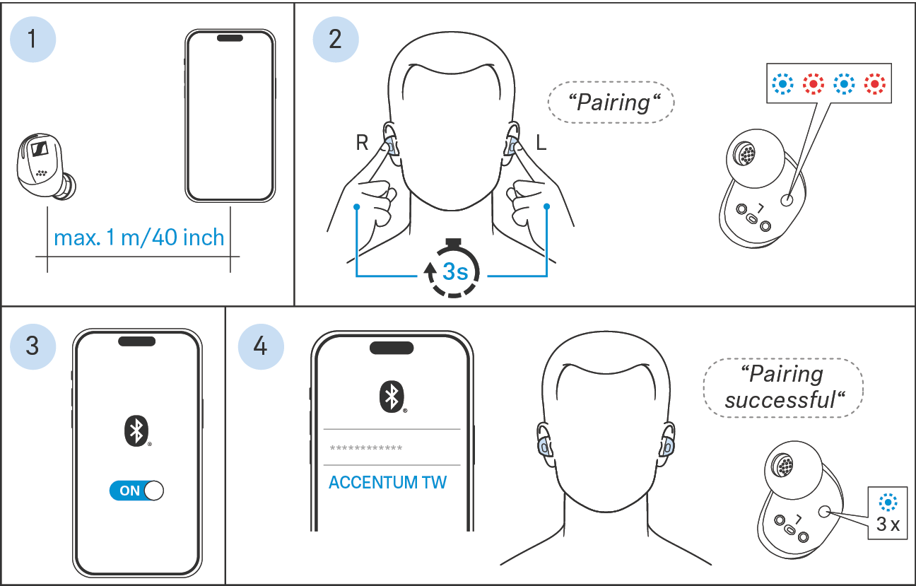 1.Take both earbuds out of the charging case and insert them into your ears (> Inserting the earbuds into the ears). The distance between the earbuds and the Bluetooth device should not exceed 40"/1 m.